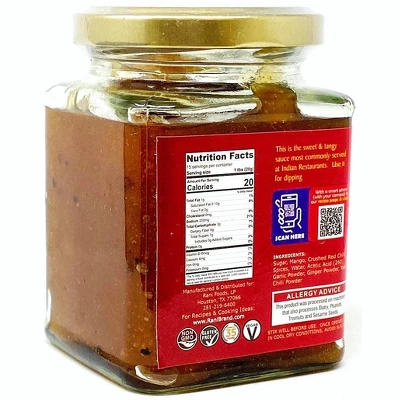 Ingredients: Sugar, Mango, Crushed Red Chilli, Spices, Water, Acetic Acid (260), Garlic Powder, Ginger Powder, Red Chilli Powder