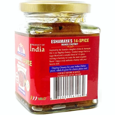 Authentic Indian Chutney 14-Spice Eshamaya’s Mango Chutney is a unique and flavorful condiment made from ripe mangoes and a carefully curated blend of 14 different spices. This chutney combines the sweetness of mangoes with a spicy, tangy, and aromatic complexity from the spices, creating a rich and balanced flavor profile.