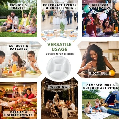 FOOD SEPARATION: Divided plates are versatile and suitable for serving a variety of meals, including main courses, side dishes, snacks, and desserts. They keep different food items separate from one another. This is particularly helpful for picky eaters or individuals who prefer to keep flavors and textures from mixing.ENVIRONMENT FRIENDLY: Our biodegradable plates with compartments are usually made from renewable and plant-based materials such sugarcane fibers. This materials is chosen because it fully breaks down in 70 days compared to conventional plastic or polystyrene products.HEAVY-DUTY AND STURDY: Designed to be strong and durable, making them suitable for a wide range of food types, including hot and cold dishes.REDUCED PLATE CLUTTER: Made to have 5 round compartments to eliminate the need for multiple dishes or bowls to serve various foods, which can help reduce plate clutter and make mealtime more manageable. It can also hold your cups which is very convenient!