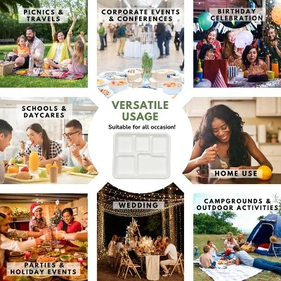 FOOD SEPARATION: Divided plates are versatile and suitable for serving a variety of meals, including main courses, side dishes, snacks, and desserts. They keep different food items separate from one another. This is particularly helpful for picky eaters or individuals who prefer to keep flavors and textures from mixing.ENVIRONMENT FRIENDLY: Our biodegradable plates with compartments are usually made from renewable and plant-based materials such sugarcane fibers. This materials is chosen because it fully breaks down in 70 days compared to conventional plastic or polystyrene products.HEAVY-DUTY AND STURDY: Designed to be strong and durable, making them suitable for a wide range of food types, including hot and cold dishes.REDUCED PLATE CLUTTER: Made to have 5 square deep compartments to eliminate the need for multiple dishes or bowls to serve various foods, which can help reduce plate clutter and make mealtime more manageable. It can also hold your cups which is very convenient!