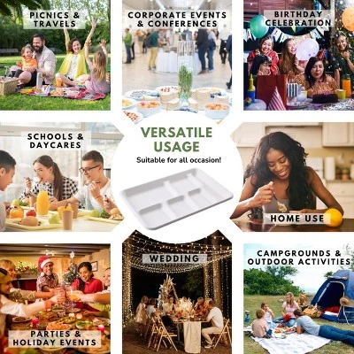 FOOD SEPARATION: Divided plates are versatile and suitable for serving a variety of meals, including main courses, side dishes, snacks, and desserts. They keep different food items separate from one another. This is particularly helpful for picky eaters or individuals who prefer to keep flavors and textures from mixing.ENVIRONMENT FRIENDLY: Our biodegradable plates with compartments are usually made from renewable and plant-based materials such sugarcane fibers. This materials is chosen because it fully breaks down in 70 days compared to conventional plastic or polystyrene products.HEAVY-DUTY AND STURDY: Designed to be strong and durable, making them suitable for a wide range of food types, including hot and cold dishes.REDUCED PLATE CLUTTER: Made to have 6 square compartments to eliminate the need for multiple dishes or bowls to serve various foods, which can help reduce plate clutter and make mealtime more manageable. It can also hold your cups which is very convenient!