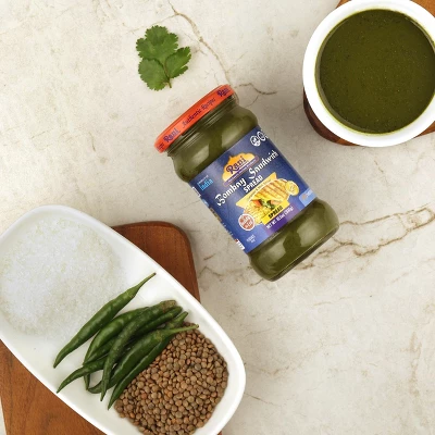 Ingredients:Coriander Leaves, Mint Leaves, Sugar, Water, Green Chilli, Salt, Lentils (Bengal Gram), Dehydrated lemon juice, Acidity Regulators [Citric Acid (330), Acetic Acid (260)], Cumin Powder, Stabiliser [Xanthan Gum (415) Colour (Brilliant Blue FCF) & Preservative [Sodium Benzoate (211)]