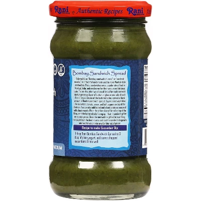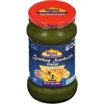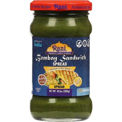 Authentic Indian Product The pulsating taste of Rani Bombay Sandwich Spread captures the essence of Bollywood. A medley of fresh coriander and mint leaves, spiced with green chillies and a hint of coconut. It is ideal used as a spread on sandwiches or on Indian naan bread, alternatively for making a delicious raita.
