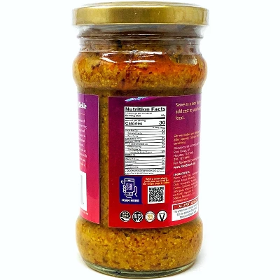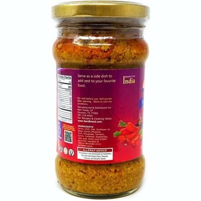Ingredients: Carrot, Chilli, Salt, Sunflower Oil, Water, Spices (Mustard, Chilli, Fenugreek, Turmeric, Cumin, Coriander, Asafoetida), Lime pulp, Acetic acid, Sodium Benzoate