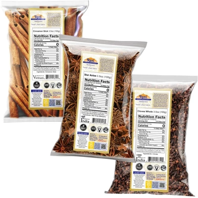 Authentic Indian Spices Rani’s Variety Pack of Cinnamon Sticks, Whole Cloves, and Star Anise combination come in a VALUE pack of three bags which are Perfect for Baking, Cooking & Beverage!