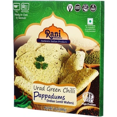 Pappadums Are thin Lentil Chips and are probably the most commonly eaten Indian foods around the world. Rani Papad are made to a traditional Indian recipe and are sun dried to preserve the flavors. They are ideal when served with Rani Brand Chutney’s and Pickles, either as a starter, snack or main meal accompaniment