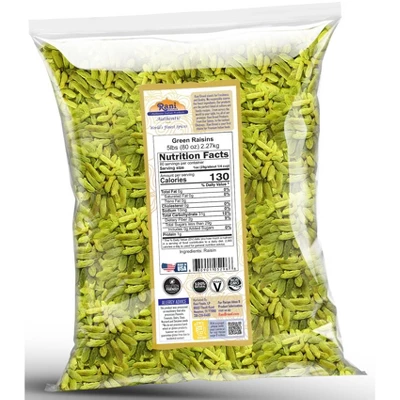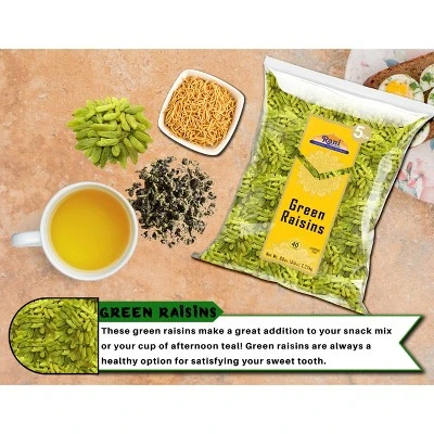 Green raisins are dried grapes with a natural green hue, made by air-drying specific grape varieties. They are mildly sweet, tangy, and soft in texture, offering a unique flavor profile compared to traditional golden or black raisins. Green raisins are rich in natural sugars, dietary fiber, vitamins, and minerals like iron, potassium, and antioxidants, making them a healthy snack and versatile culinary ingredient.