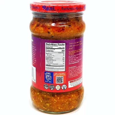 Ingredients: Mixed Vegetable Pieces (Mango, Lime, Green Chilli, Carrot, Ginger), Sunflower Oil, Salt, Spices (Mustard, Chilli, Fenugreek, Turmeric, Fennel, Nigella Sativa, Asafoetida, Lime Paste, Acetic acid (260) as Acidity Regulator & Sodium Benzoate (211) as Preservative
