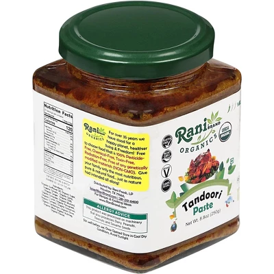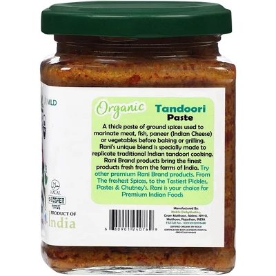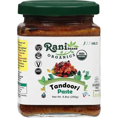 Organic Tandoori Paste A thick paste of ground spices used to marinate meat, fish, paneer (Indian Cheese) or vegetables before baking or grilling. Rani’s unique blend is specially made to replicate traditional Indian Tandoori cooking. Rani Brand products bring the fines products fresh from the farms of India.