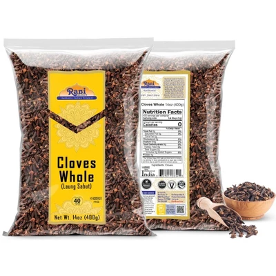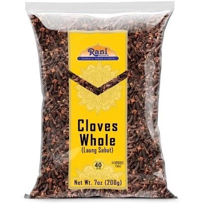 Authentic Indian Spices Cloves are the aromatic unopened flower buds of a small evergreen tree native to the Moluccas (Indonesia). Cloves are essential in garam masala and appear in many curry powder recipes. In Indian cuisine, it lends a hand to chutneys and many pickle dishes. It has also become an major ingredient in many rice recipes such as pullo and biryani. Cloves have an assertive, dark aroma that is warm and rich. Rani Brand are hand selected, and cleaned. They have a high oil content for rich full flavor!