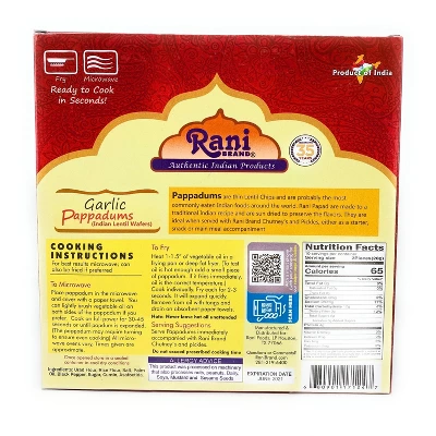 Pappadums are thin Lentil Chips and are probably the most commonly eaten Indian foods around the world. Rani Papad are made to a traditional Indian recipe and are sun dried to preserve the flavors. They are ideal when served with Rani Brand Chutneys and Pickles, either as a starter, snack or main meal accompaniment.