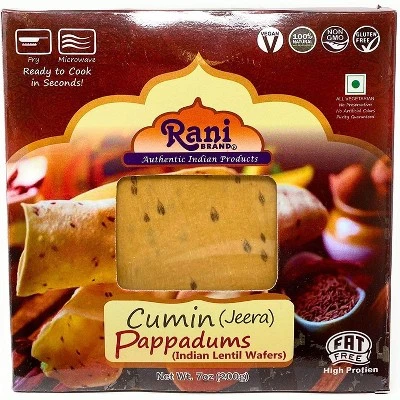 Pappadums are thin Lentil Chips and are probably the most commonly eaten Indian foods around the world. Rani Papad are made to a traditional Indian recipe and are sun dried to preserve the flavors. They are ideal when served with Rani Brand Chutneys and Pickles, either as a starter, snack or main meal accompaniment.
