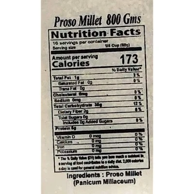 Authentic Indian Origin Millet Proso millet is a small, ancient grain that belongs to the millet family. It is gluten-free, high in protein, fiber, and essential minerals like iron, magnesium, and phosphorus. It has a mild, nutty flavor and a light, fluffy texture when cooked. Proso millet is often used as a healthy, gluten-free alternative to rice, couscous, or other grains.
