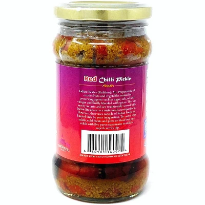 Ingredients: Red Chili Pieces, Sunflower Oil, Salt, Spices (Mustard, Chilli, Fenugreek, Turmeric, Fennel, Black Cumin, Thyme, Dry Mango Powder, Asafoetida), Acetic Acid (260) & Citric Acid (330) as Acidity Regulator & Sodium Benzoate (211) as Preservative
