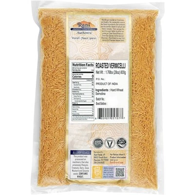 Roasted vermicelli, also known as roasted wheat noodles, is a type of thin pasta made from wheat flour that has been pre-toasted to a golden-brown color. This roasting process enhances the flavor of the vermicelli, giving it a nutty, slightly toasted taste, and also shortens its cooking time compared to raw vermicelli. It is commonly used in Indian cuisine for preparing quick and flavorful dishes, both sweet and savory. In sweet dishes, roasted vermicelli is often used in desserts like seviyan kheer, where it is cooked with milk, sugar, and aromatic spices.