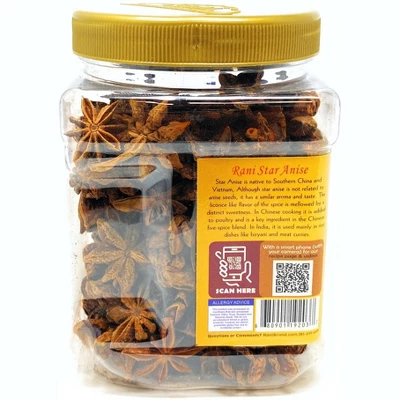 Authentic Indian Spices Star Anise is native to Southern China and Vietnam. Although not related to anise seeds, it has a similar aroma and taste. The licorice like flavor of the spice is mellowed by a distinct sweetness. In Chinese cooking it is added to poultry and is a key ingredient in the Chinese five-spice blend. In India, it is used mainly in rice dishes like biryani and meat curries. Star anise is either used as a whole or in grounded form.