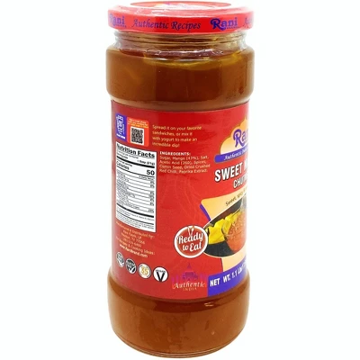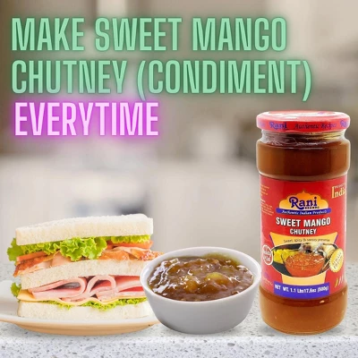 Authentic Indian ChutneySweet mango chutney is a delicious and tangy condiment made from ripe mangoes, sugar, vinegar, and a blend of aromatic spices. This chutney highlights the natural sweetness of mangoes, balanced with a mild tartness from the vinegar and warmth from spices. Often found in Indian and Southeast Asian cuisine, sweet mango chutney has a thick, jam-like consistency and a vibrant flavor profile that combines fruity sweetness with subtle spice.